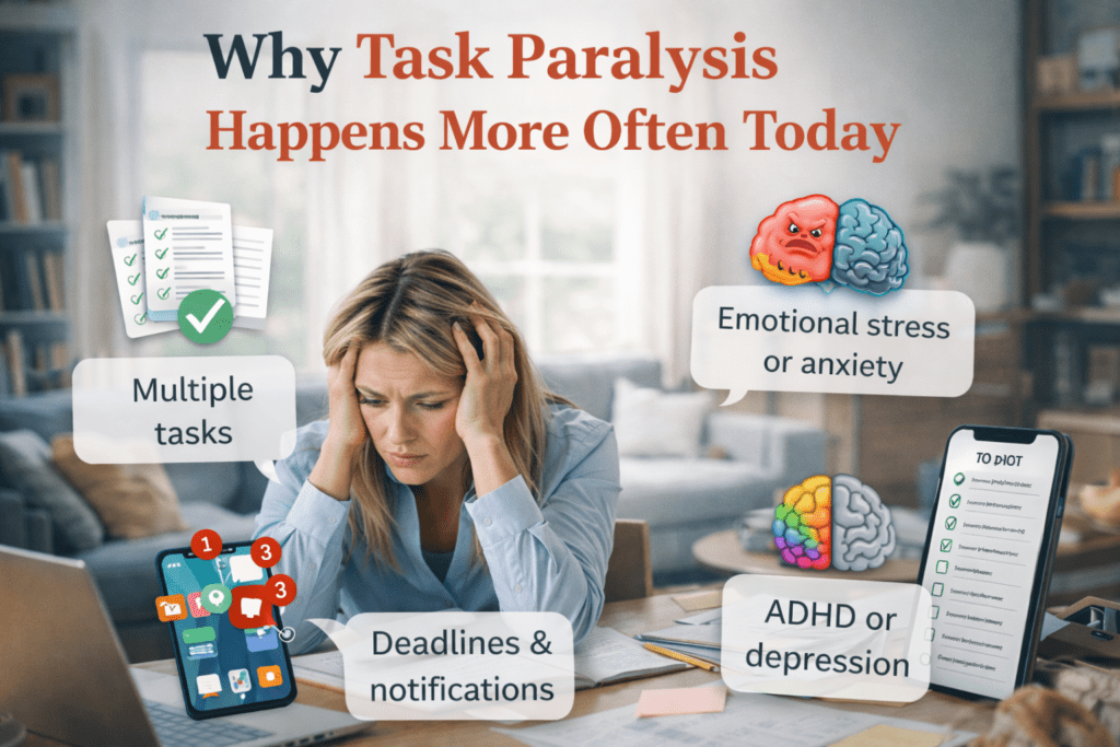 Task paralysis happens when the brain feels overloaded and shuts down instead of taking action. In today’s always-on world—filled with deadlines, notifications, and pressure—this experience is becoming increasingly common.